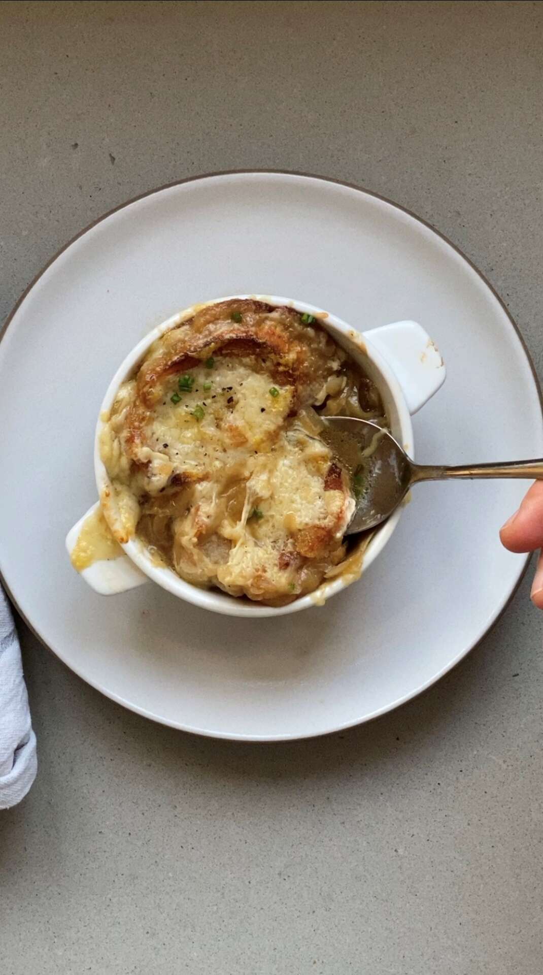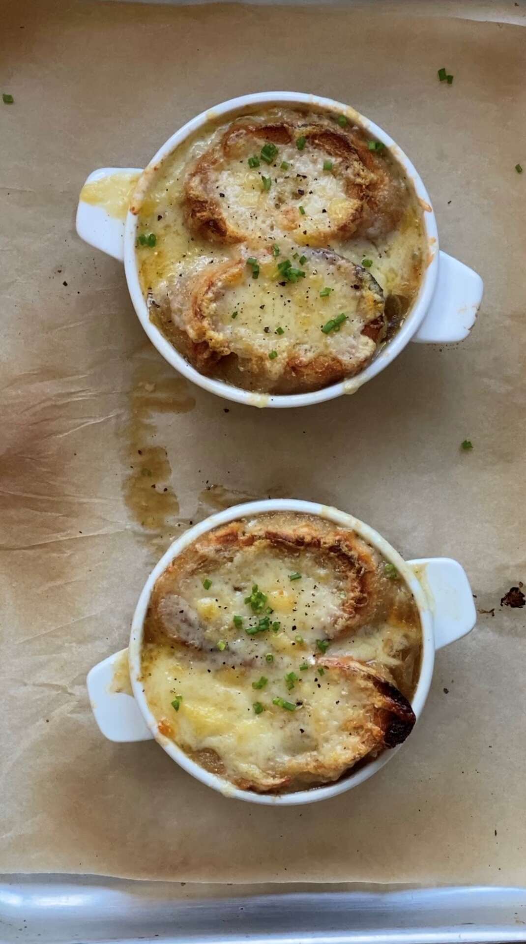 Once soup is finished simmering, ladle soup very high into your ovenproof serving bowls set on top of a baking tray.