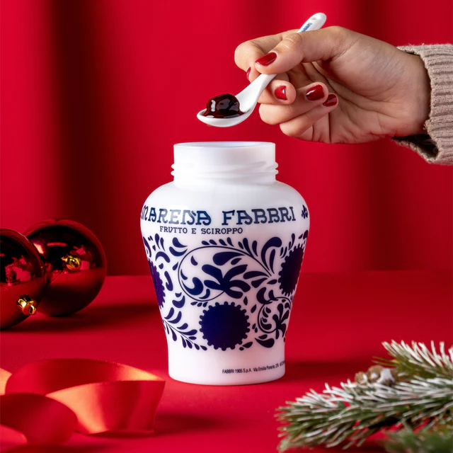 Its unmistakeable taste and popularity has endured for over 100 years. We have Gennaro Fabbri and his wife, Rachele, to thank for its creation. The Amarena cherry, a variety of Prunus cerasus (a black sour cherry) grows wild in Bologna and Modena. His wife took the opportunity to pick these cherries and cook them in sugar, in copper pots. Gennaro liked the candied cherries so much he bought a blue and white ceramic jar for his wife as a thank you present. They later decided to sell the cherries in syrup in these ceramic jars and the family run company have been doing so ever since.