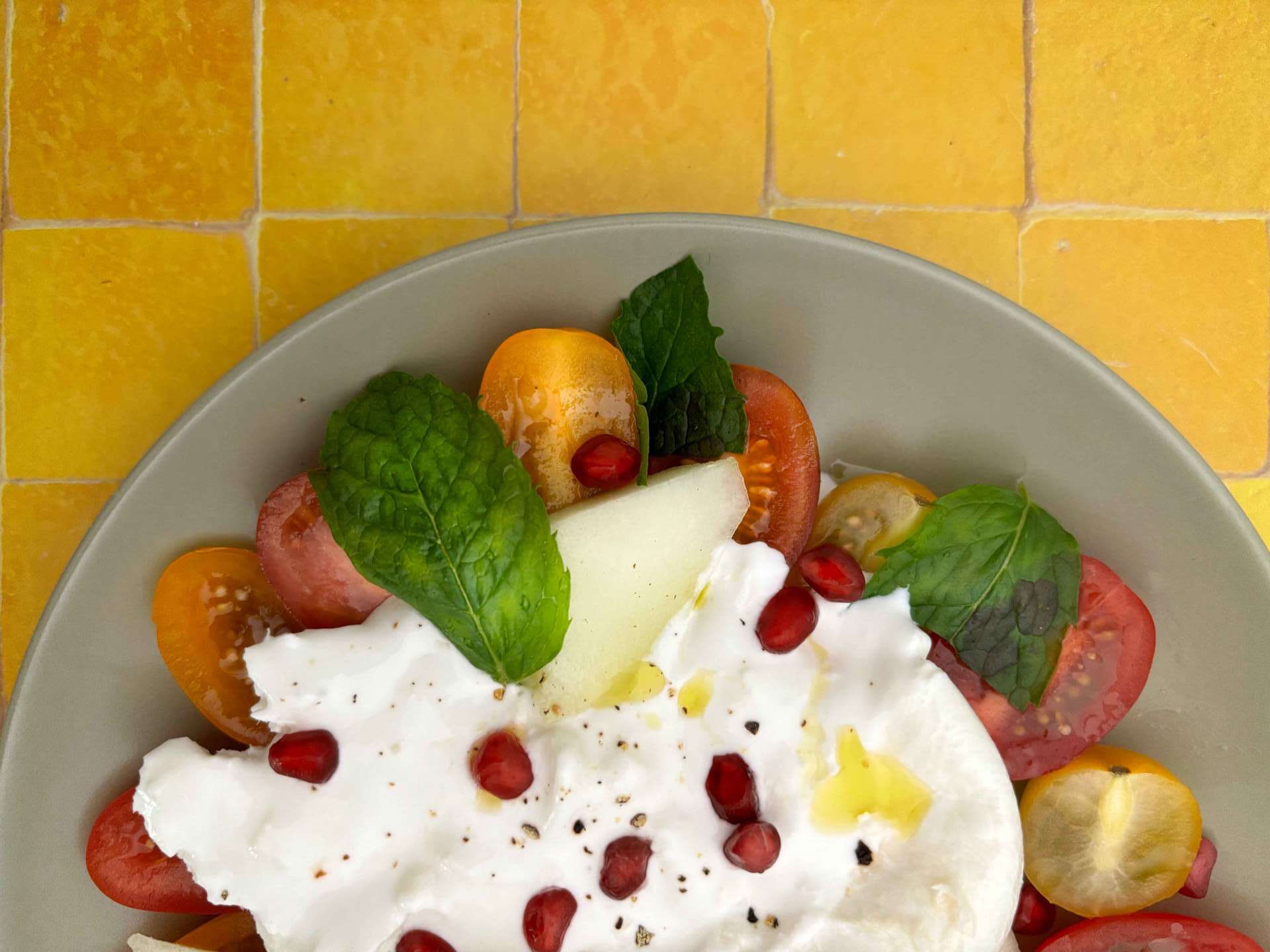 Tomato, melon, pomegranate, and burrata salad