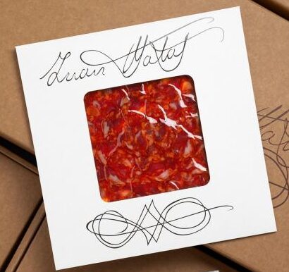 Sliced chorizo cular Iberico sourced from Salamanca. Juan Matas have been curing meat for three generations using natural drying methods and the finest quality Iberico pork.