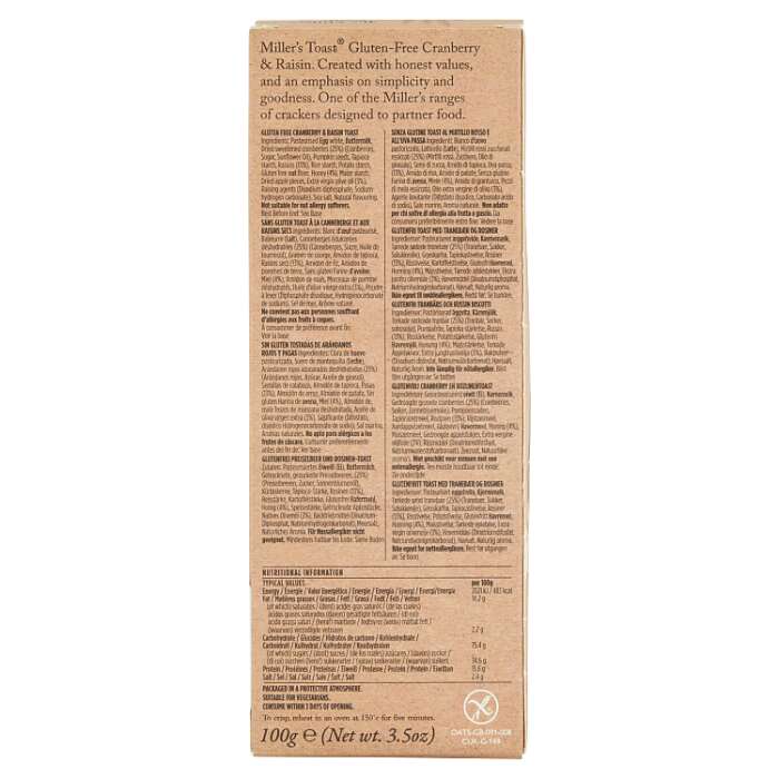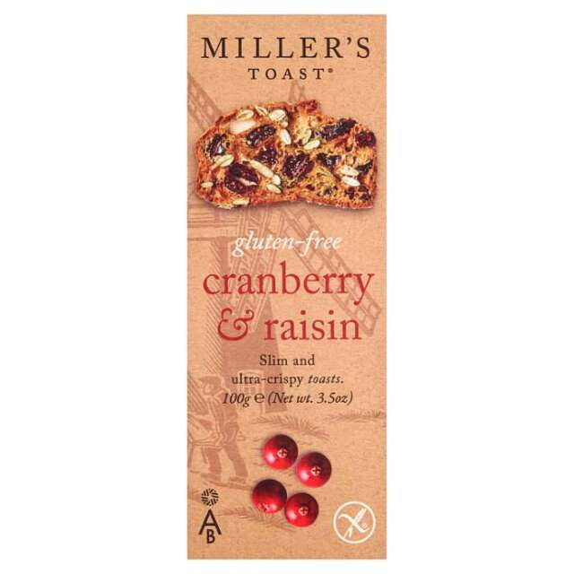 Slim and ultra-crispy toast. Baked by Hand. Suitable for Vegetarians. Miller’s Toast Cranberry & Raisins. The slimmest and crispiest ‘toast’ to partner with cheese, or just to nibble on.