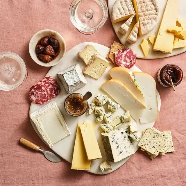 Délice de Bourgogne: Soft, double cream, pasteurised cow’s milk cheese. Surrounded by a white bloom rind smelling faintly of mushrooms, the interior of this sumptuous, 72% butterfat cheese is a soft white paste that tastes like a heavenly mixture of butter and stiffly whipped cream.