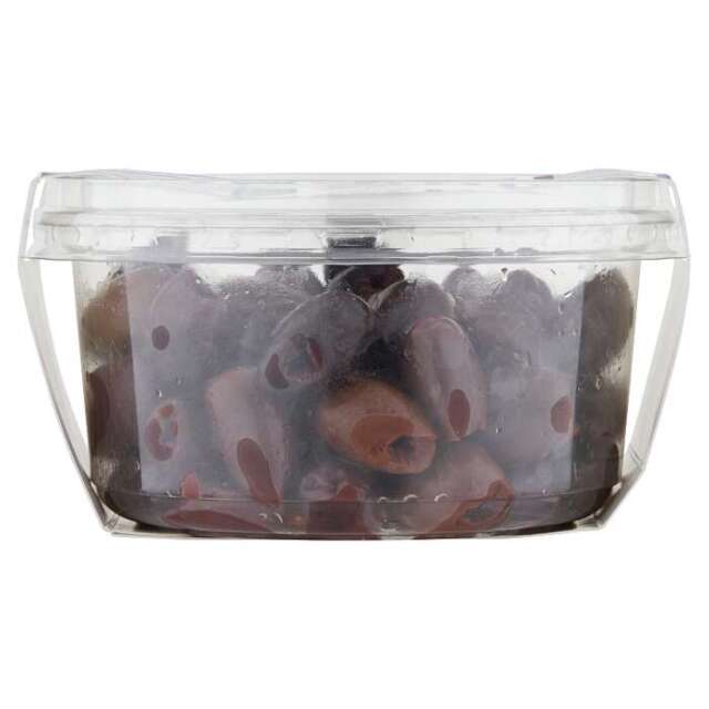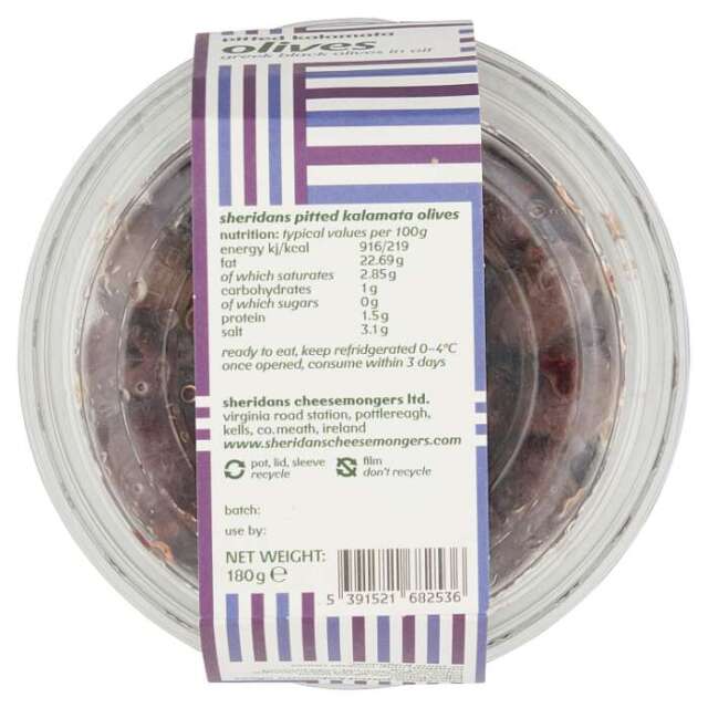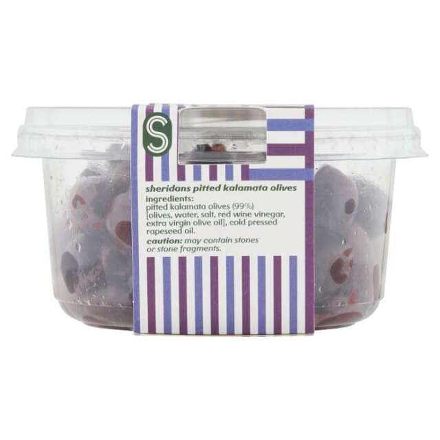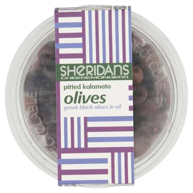 Sheridans Pitted Kalamata Olives, almond-shaped olives known for their rich, fruity flavor and smooth, meaty texture. Naturally brined, they have a slightly tangy, wine-like taste that makes them a classic choice for Mediterranean dishes and antipasti spreads.