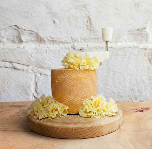 In Switzerland, and across the continent, Tete de Moine is general served in little rosette shapes, formed by impaling the cheese on a purpose-made cutter, a girollin and scraping rounds from the top of the cheese. Interestingly this device was only invented in the 1980’s but sales of Tete de Moine have boomed since. By scraping the cheese with this device, it gently creates friction and more surface area, enhancing the flavours and aromas further. This principal can be applied to many a firm cheese with varying results. The reddish-brown rind of the Tete de Moine has a pungent, spicy aroma which permeates the smooth paste and gives Tete de Moine a unique, pungent flavour. Try it with beer.